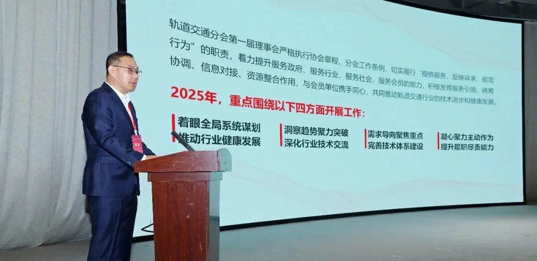 朱长喜在讲话中指出,在全面建设社会主义现代化国家的新征程中,国际竞争形势、城市发展阶段、技术迭代更新等多重因素深刻影响着勘察设计行业的发展。轨道交通作为城市基础设施的重要组成部分,已经和城市一同迈入以存量提质更新为主的新发展阶段。轨道交通分会应当引导行业全面贯彻中央城市工作会议精神,更加注重以人为本,牢牢守住城市安全底线,以设计创新赋能城市内涵式发展。一是要坚持初心不改,发挥勘察设计引领作用,引领广大会员企业向工程建设全产业链延伸,为轨道交通运营、更新改造、资源循环利用等全生命周期各阶段提供高端技术服务。二是要坚守安全底线,筑牢韧性城市建设根基,贯彻落实《中共中央办公厅、国务院办公厅 关于推进新型城市基础设施建设打造韧性城市的意见》,通过更新改造,提升轨道交通工程自身安全水平,保障城市稳定运行。三是要坚定使命担当,完善行业发展顶层设计,落实行业组织“服务国家、服务社会、服务群众、服务行业”的职责,组建专家团队,开展具有前瞻性、系统性的行业发展统筹谋划,提升服务效能。