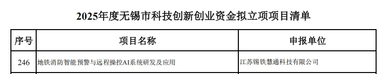 近日,2025年度无锡市科技创新创业资金“太湖之光”科技攻关计划(产业前瞻及关键技术研发)项目清单正式公示。无锡地铁集团下属慧通公司申报的“地铁消防智能预警与远程操控AI系统研发及应用”项目成功入选,并获得无锡市科技创新创业资金支持。 “太湖之光”科技攻关计划,是无锡市为加快建设具有国际影响力的产业科技创新高地而设立的核心载体。该计划聚焦集成电路、生物医药、高端装备等战略性新兴产业及未来产业,重点支持有望突破关键核心技术瓶颈、引领产业升级的前沿研发项目。其立项评审严谨,对项目的创新性、可行性及团队实力均有高标准要求,入选的项目代表了各技术领域的先进水平。