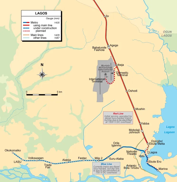 拉各斯轻轨蓝线项目由中国土木承建,中车大连供车。全长27公里,共计11座车站,其中一期线路长13公里,二期长约14公里。一期工程于2023年9月通车,同期拉各斯州政府与中国土木签署二期合同。拉各斯蓝线是西非第一条电气化城市轻轨,也是由中国企业自主设计、建造、施工和运营的全产业链电气化城市轻轨交通项目。