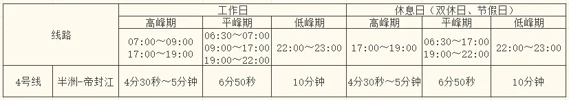 备注:4号线超高峰时段为07:30~08:30、17:45~18:45,期间最小行车间隔为4分30秒。