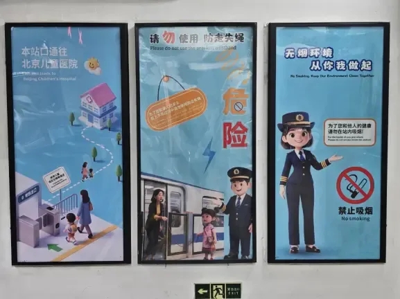 近日,走进复兴门站,不难发现这里悄然“焕新”:出入口处的墙贴上清晰标注换乘及儿童医院方向;楼梯玻璃上张贴“防走失绳”安全提示。站厅内,一棵绘满卡通图案的“大树”墙贴,树下设置地铁列车造型的儿童沙发和彩色跳格子地贴,让孩子们在等候时转移注意力,就连墙壁上宣传海报,都融入了可爱元素;升级后的母婴室也超贴心!贴了软萌的卡通贴纸,还加了招援提示,私密性和温馨感都直线上升,婴儿隔尿垫、柔湿巾、纸尿裤等“带娃刚需品”配备到位,如需使用,可联系车站工作人员或拨打服务电话。精细化服务不仅解决了家长们的燃眉之急,还能稍稍缓解带娃去医院的紧张情绪。