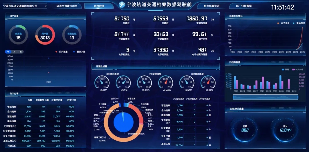 自2023年入选国家档案局企业集团数字档案馆(室)建设第二批试点名单以来,宁波轨道交通以《“十四五”全国档案事业发展规划》为引领,围绕企业数字化转型与核心竞争力提升目标,系统推进档案管理体系重塑与能力升级。集团公司以统建方式组织开展总部及11家所属单位的数字档案室建设,目前,集团公司总部及下属各分子公司档案数字化率均已达到或接近100%,档案总量突破10万卷、17万件,数据容量达9.5太字节(TB)。