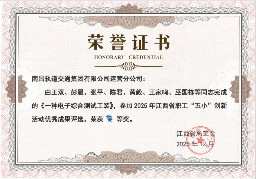 近日,从江西省职工“五小”创新活动优秀成果发布会传来喜讯,由运营分公司维修中心电子创新工作室自主研发的《一种电子测试综合工装》项目,在全省众多创新成果中脱颖而出,荣获三等奖!这份荣誉,不仅是对研发团队智慧与辛勤付出的高度认可,更是对南昌地铁坚持科技创新、深耕轨道交通技术领域的充分肯定。