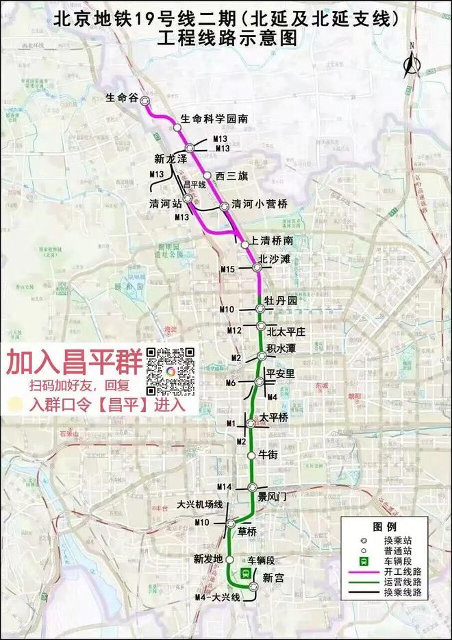 19号线二期(北延及北延支线),全长约24.2公里。其中,北延线路南起19号线一期既有牡丹园站,北至生命谷站,全长约17.1公里,设站7座,分别为北沙滩站、上清桥南站、清河小营桥站、西三旗站、新龙泽站、生命科学园南站、生命谷站,其中换乘站4座。