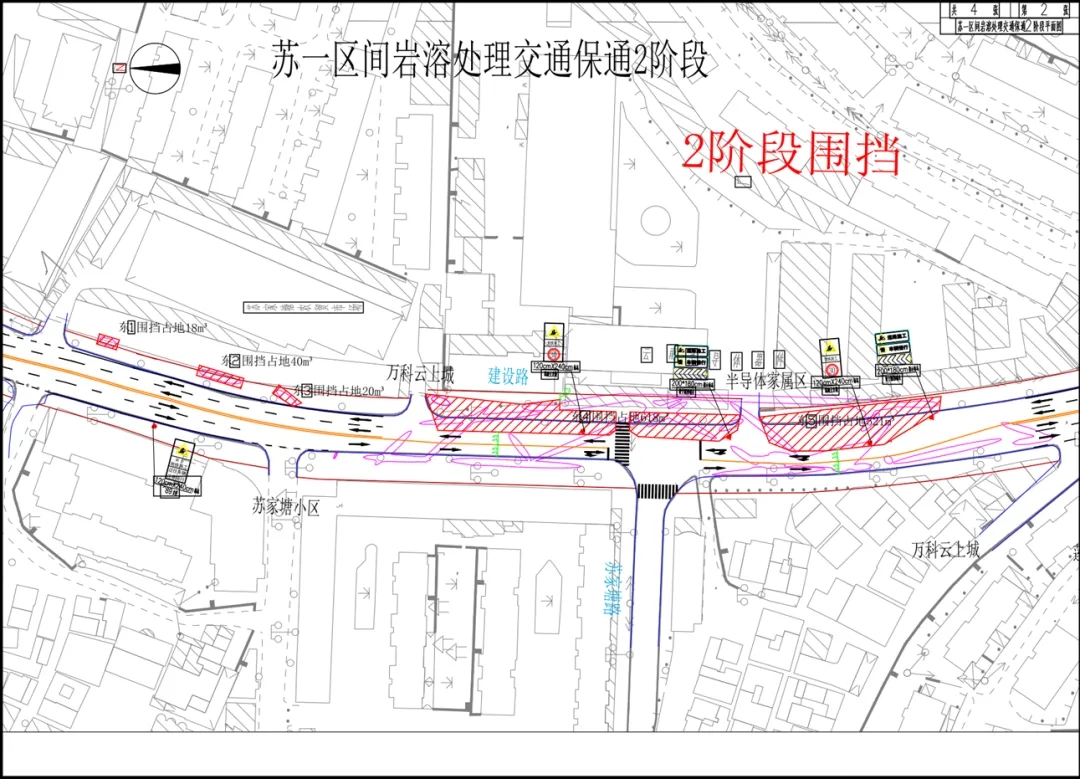 苏一区间岩溶处理施工交通疏解第一期围挡共分为四阶段,依次进行建设路西侧小里程(靠近学府路方向)一阶段围挡、东侧小里程二阶段围挡、西侧大里程(靠近一二一大街方向)三阶段围挡、东侧大里程四阶段围挡(详见附图)。每阶段围挡均保障建设路8m双向2条机动车道+非机动车道通行,临近沿街商铺保障1.5m人行通道。