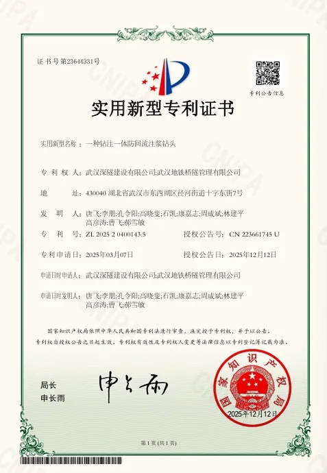 近日,武汉地铁桥隧公司研发的“富水砂层深埋隧道异常沉降洞内自适应调控技术”获得两项国家实用新型专利,并已成功应用于多家地铁的运营维保。