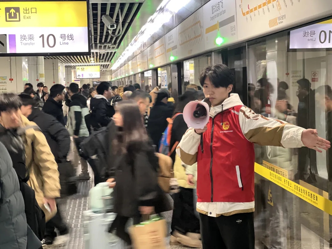 当看到乘客在闸机前因刷码失败而慌乱,志愿者会快步上前安抚:“您试试把手机亮度调高点,对准扫码区再慢一点——对,这样就成功了……”车站的出入口、站台、闸机、电扶梯等关键区域,随处可见他们忙碌的身影。志愿者们以温和的笑容,化解了旅客初到重庆的陌生感,让繁忙的车站井然有序。