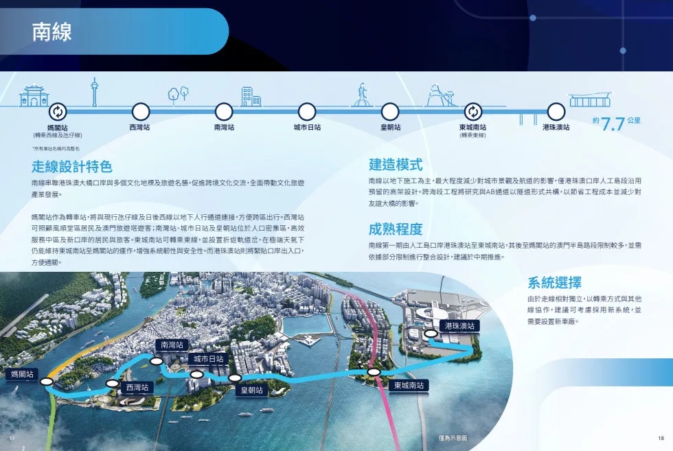 具体线路规划中,中期将重点推进南线建设,设7个站点,分别为妈阁站、西湾站、南湾站、城市日站、皇朝站、东城南站(换乘东线)、港珠澳站,全长约7.7公里。连接港珠澳大桥人工岛口岸与新城A区、中区等区域,以地下建造为主,最大程度减少城市景观及航道的影响,仅港珠澳口岸人工岛段沿用预留的高架设计,跨海段与AB通道以隧道形式共构,以节省工程成本并减少对友谊大桥的影响。