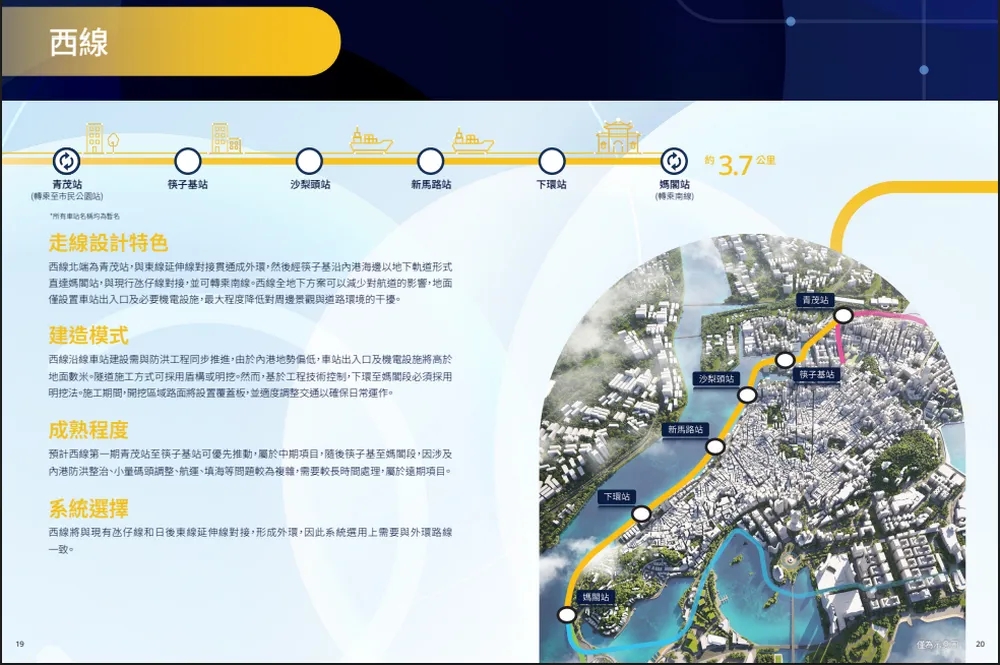由于内港地势较低,车站出入口及机电设施需抬高至地面之上,建设工作将与防洪工程同步推进。建议西线工程可分期实施,先推动青茂至筷子基段,属于中期项目,筷子基至妈阁段因涉及防洪整治及内港现有设施处理等复杂因素,建议暂列为远期项目。西线将与氹仔线、东线延伸线组成外环网络,采用与外环路线一致的系统。