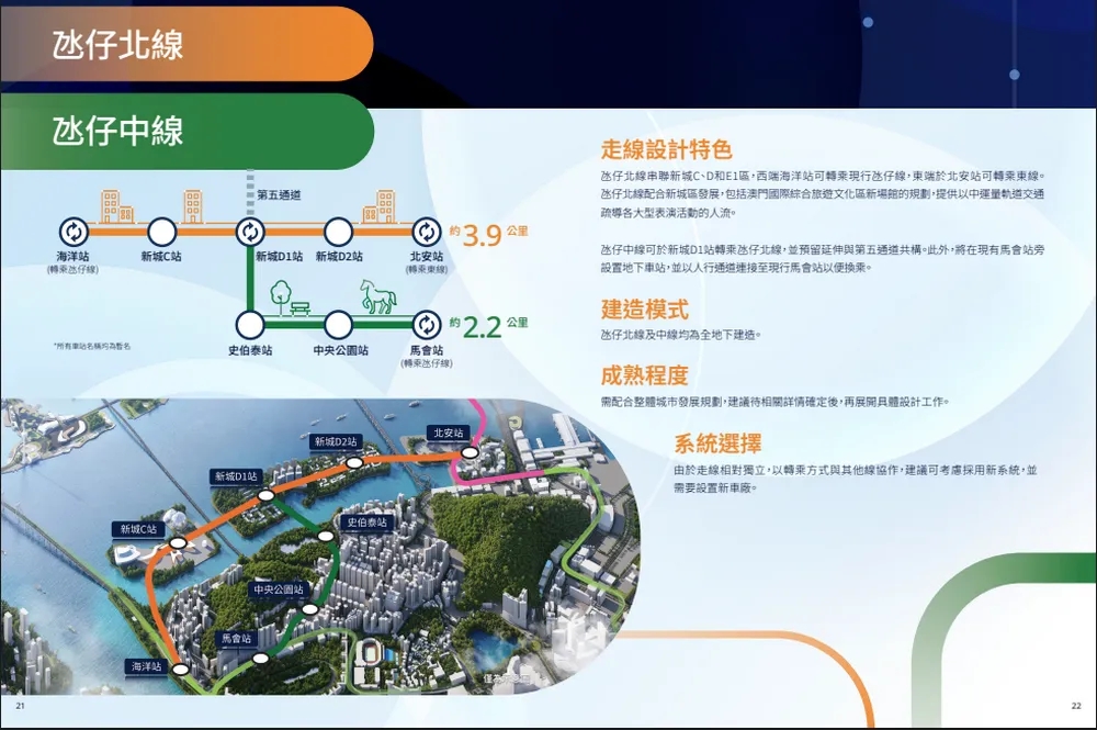 至于氹仔北线及氹仔中线,氹仔北线设有五个车站,分别为海洋站、新城C站、新城D1站、新城D2站及北安站,连通主要旅游及文化设施,氹仔北线乘客可在海洋站换乘现有氹仔线,或在未来北安站换乘东线。