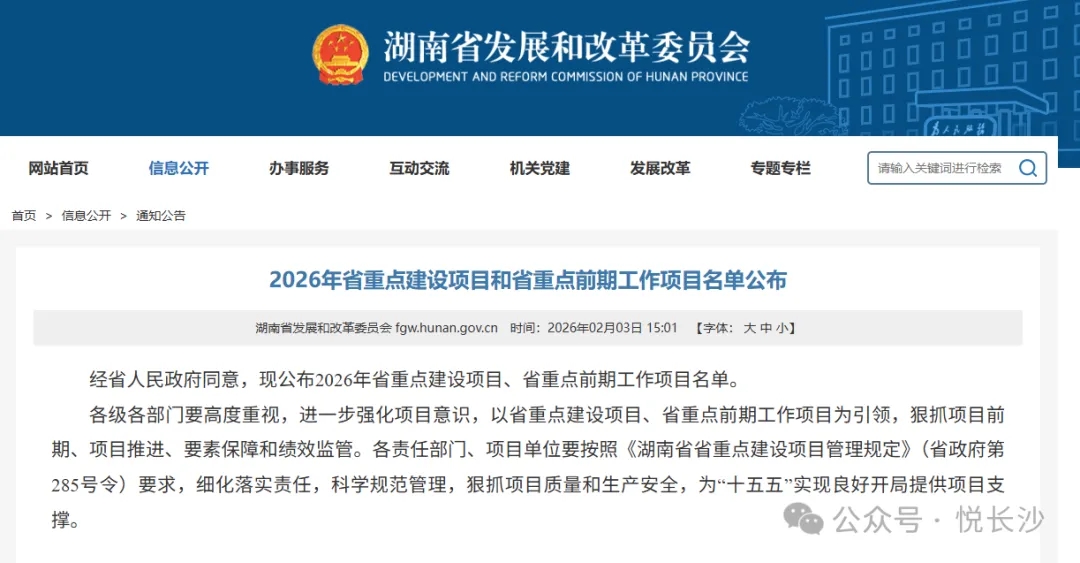 2月3日,湖南公布2026年省重点建设项目和省重点前期工作项目名单 2026年2月3日,湖南省发改委官网公布2026年省重点建设项目和省重点前期工作项目名单,分别有389个和41个,总投资高达2万亿元。 其中,铁路方面,计划建设长沙至赣州、邵阳至永州、铜仁至吉首、宜昌至常德、永州至清远至广州、黔江至吉首等12个项目。计划推进益阳至娄底、澧县至张家界、常岳九、兴永郴赣、怀化至桂林铁路等5个项目前期工作;