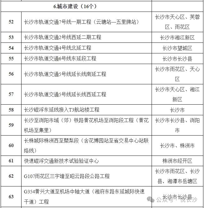 城轨方面,包括长沙市轨道交通7号线一期工程(云塘站—五里牌站)、长沙市轨道交通2号线西延二期工程、长沙市轨道交通4号线北延工程、长沙市轨道交通6号线东延段工程、长沙市轨道交通5号线延长线南延工程、长沙市轨道交通5号线延长线西延工程、长沙磁浮东延线接入T3航站楼工程、长沙至浏阳市域(郊)铁路黄花机场至浏阳段工程(黄花机场至集里)、长株城际株洲西至㮾梨段(含花博园站至省交易中心站联络线)等。