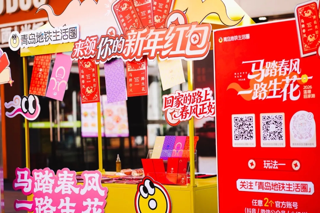 春风有信,花开有期 当2026年的第一缕春风掠过胶州湾,青岛地铁生活圈携「马年定制红包」与「崂山热可乐」双份暖意,在地铁青岛站与青岛北站掀起了一场“温暖回家路”公益行动。