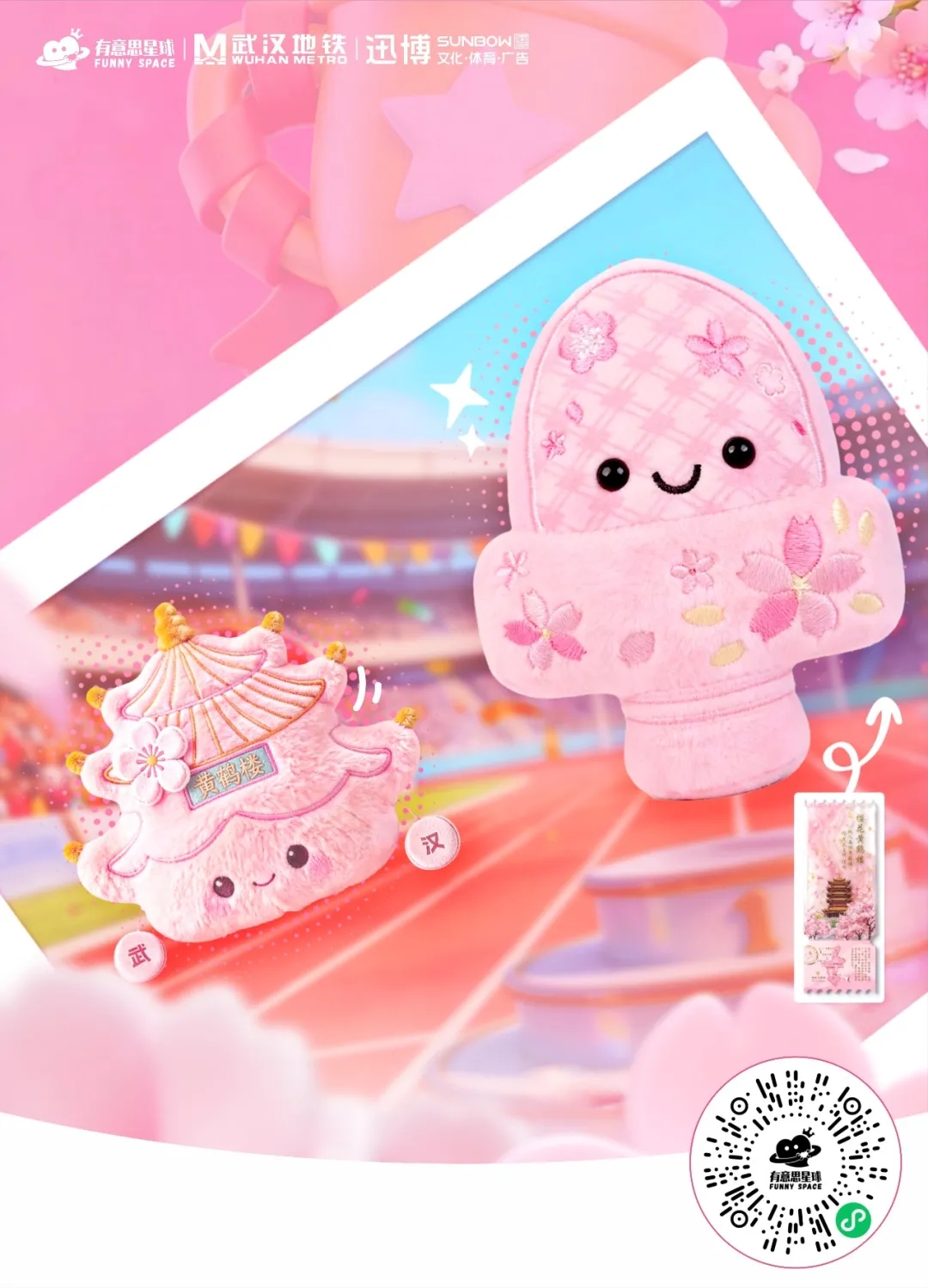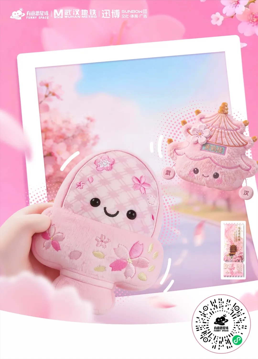 樱花季·黄鹤楼毛绒挂件:Q版黄鹤楼造型,粉樱刺绣搭配“武汉”字样,便携小巧,随身珍藏江城春色。