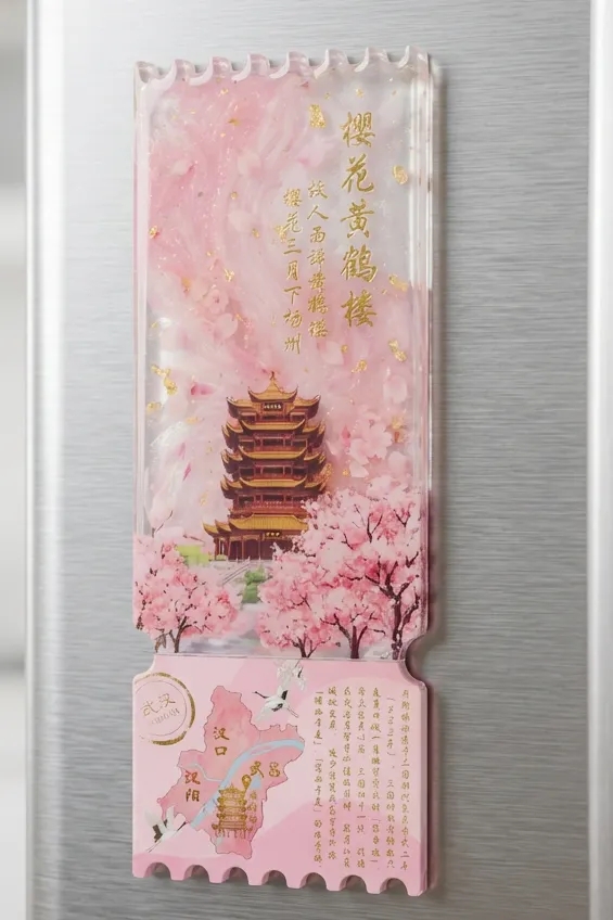 樱花季·黄鹤楼流麻冰箱贴:旅行票据造型,流沙樱瓣与黄鹤楼相映,定格春日浪漫,适合居家与工位装饰。