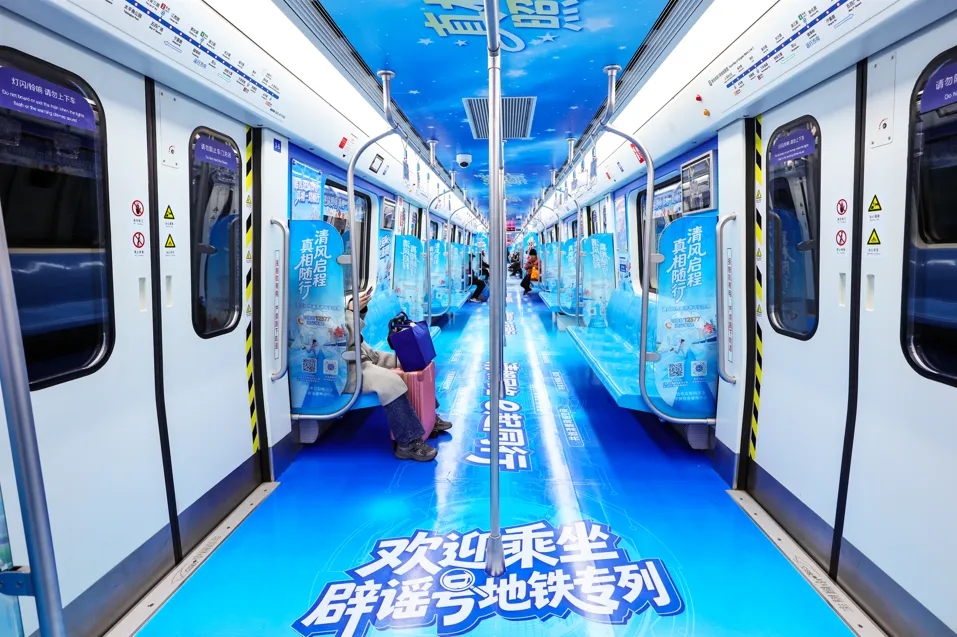 走进“辟谣号”专列,仿佛进入一处充满趣味与安心的蓝色空间。“真相如星 照亮前行”“谣言进站即停 真相一路畅行”“清朗网络 e起同行”……一句句简短有力的辟谣标语点缀在车厢各处。而“青小鸥”软萌的形象则让辨谣、抵谣的理念多了几分亲近感。除此之外这趟专列更藏着实用的“安心密码”——“12377”举报方式被置于车厢内的拉手、看板等醒目位置,市民通过扫码或拨打电话即可直通举报平台,共同构建“人人识谣、人人辟谣、人人抵谣”的良性生态。