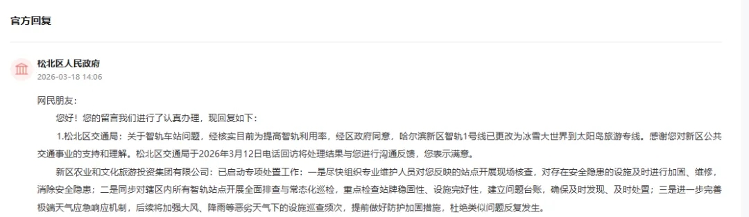 日前,黑龙江省哈尔滨松北区人民政府回复网友提问时称,关于智轨车站问题,经核实目前为提高智轨利用率,经区政府同意,哈尔滨新区智轨1号线已更改为冰雪大世界到太阳岛旅游专线。
