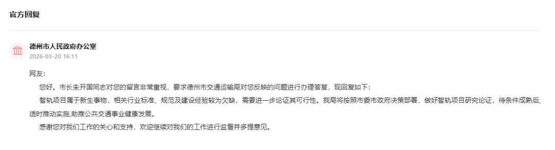 近日,德州市人民政府办公室就市民关注的智轨交通项目作出正式回应,市长朱开国亲自批示,要求相关部门就该项目进行研究和论证。智轨项目属于新生事物,相关行业标准、规范及建设经验较为欠缺,需要进一步论证其可行性。我局将按照市委市政府决策部署,做好智轨项目研究论证,待条件成熟后,适时推动实施,助推公共交通事业健康发展。