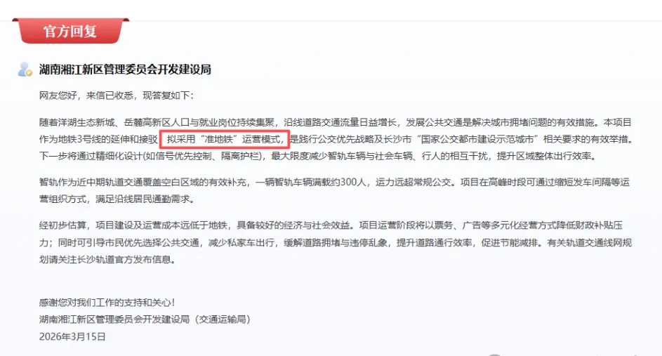对此,湖南湘江新区管理委员会开发建设局回复道:“本项目作为地铁3号线的延伸和接驳,拟采用“准地铁”运营模式,是践行公交优先战略及长沙市“国家公交都市建设示范城市”相关要求的有效举措。下一步将通过精细化设计(如信号优先控制、隔离护栏),最大限度减少智轨车辆与社会车辆、行人的相互干扰,提升区域整体出行效率。