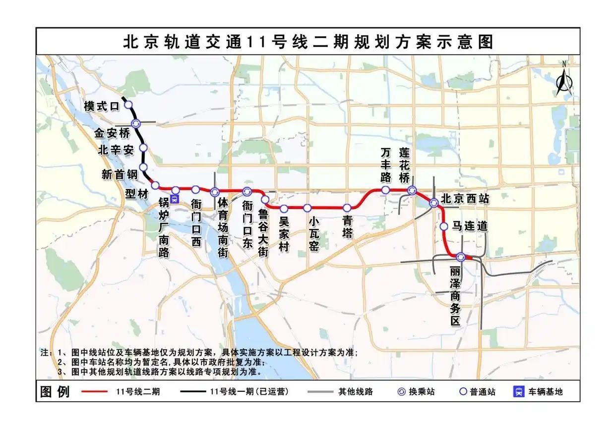 11号线二期工程服务新首钢高端产业综合服务区、鲁谷及青塔居住组团、北京西站枢纽、马连道居住组团、丽泽金融商务区和丽泽城市航站楼交通枢纽等区域;设车辆段1座,位于新首钢高端产业综合服务南区,占地约33.8公顷。