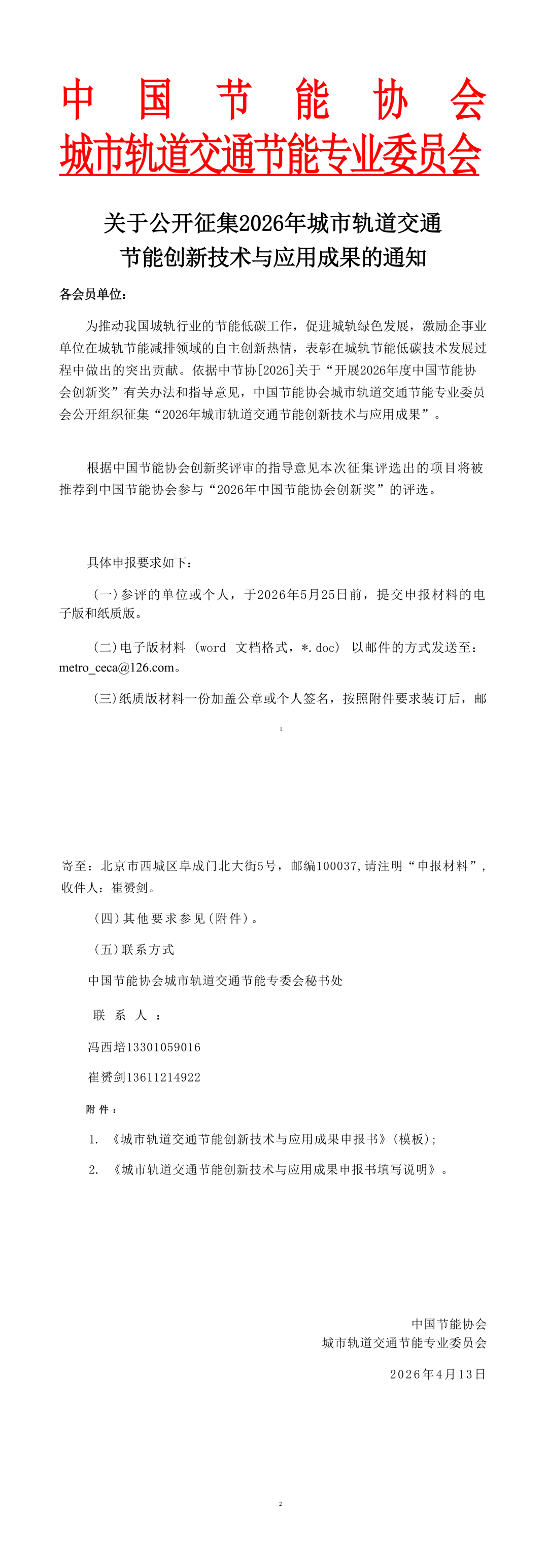 “开展2026年度中国节能协会创新奖”有关办法和指导意见,中国节能协会城市轨道交通节能专业委员会公开组织征集“2026年城市轨道交通节能创新技术与应用成果”。