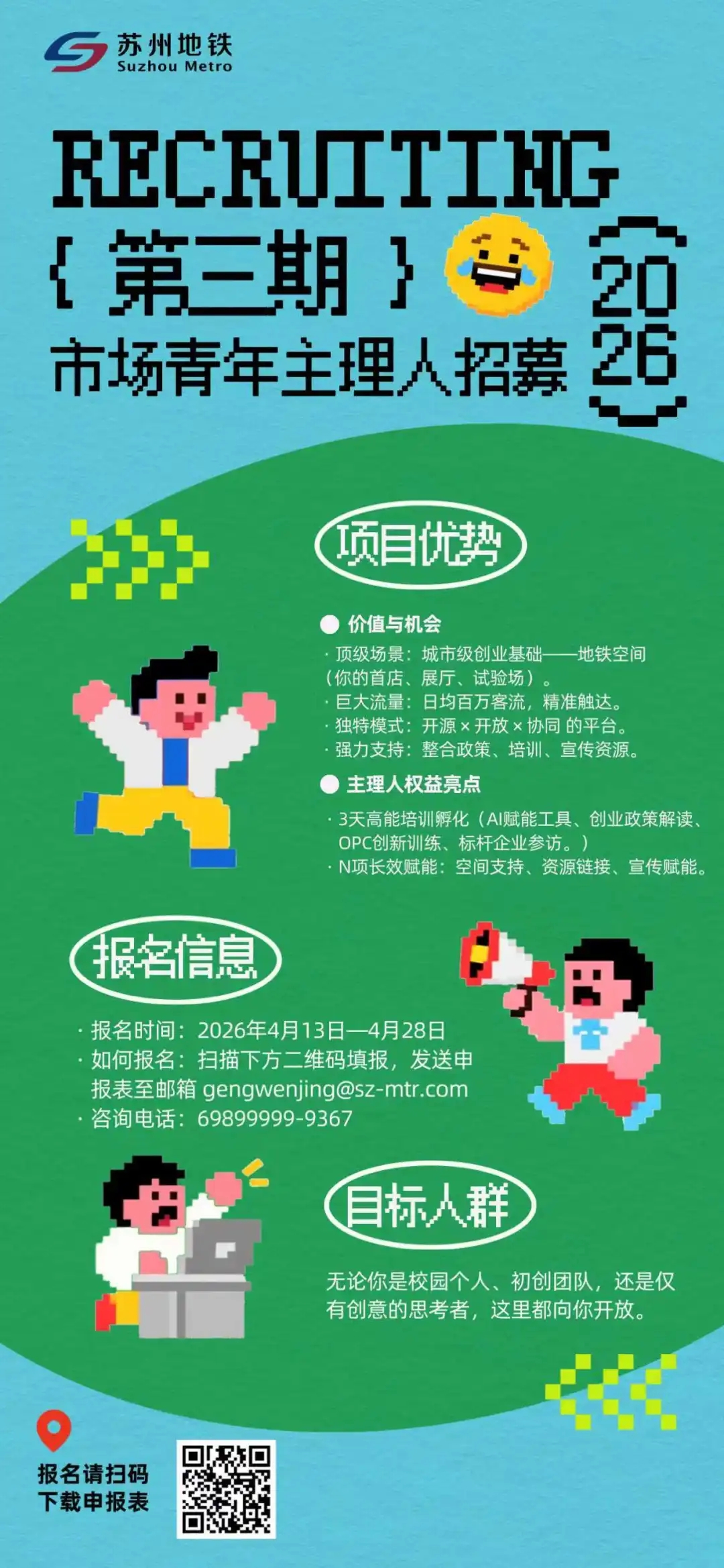 遴选方式:报名材料筛选。请提交包含完整信息的《苏州地铁第三期青年经济开源项目申报表》(扫码下载),我们将考察项目的创新性、可行性、商业潜质及与地铁资源的契合度。