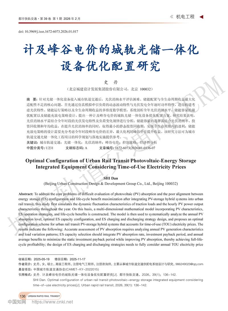 计及峰谷电价的城轨光储一体化设备优化配置研究